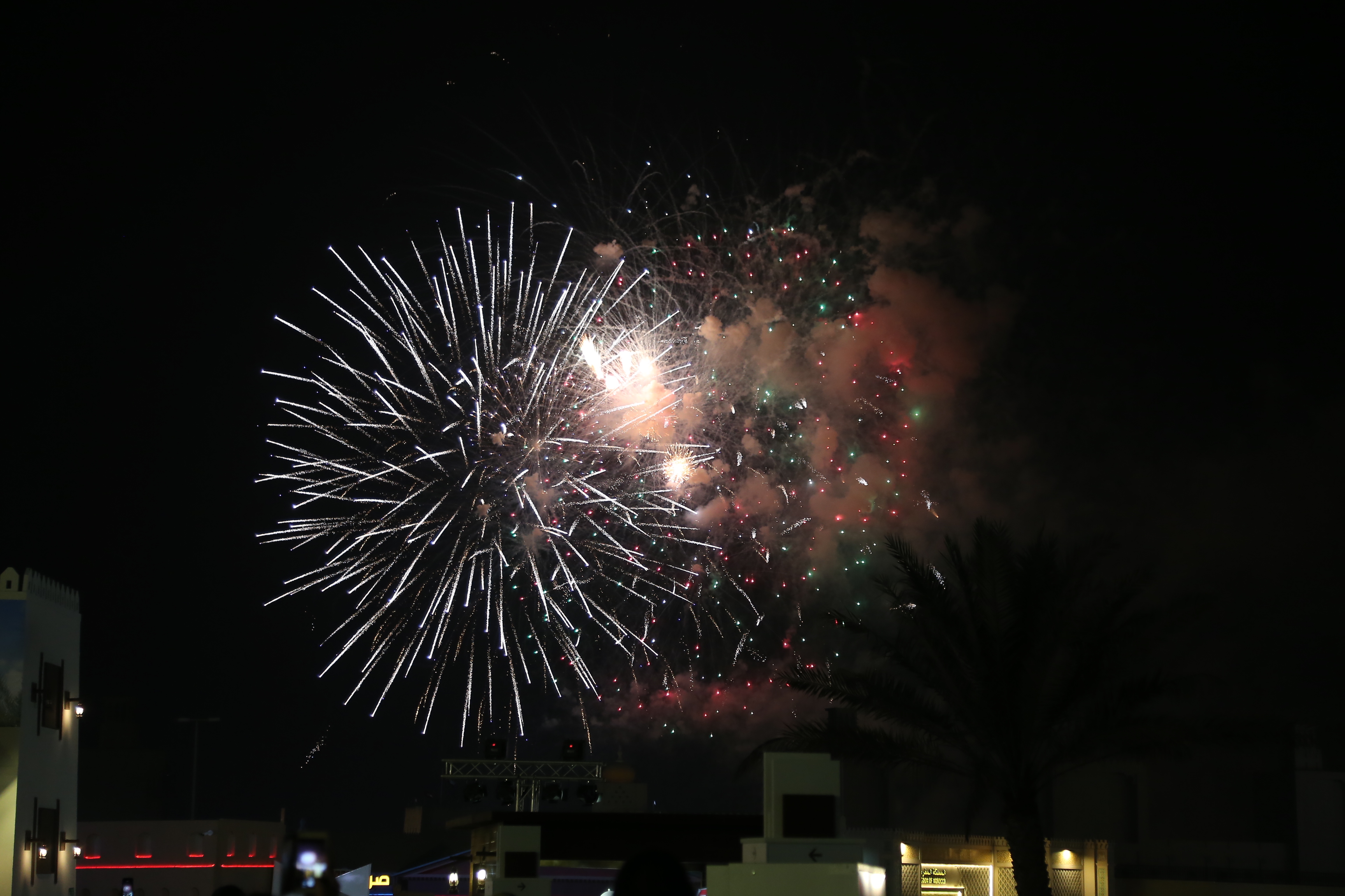 A five-minute fireworks display transforms the night sky above this luxury Abu Dhabi resort, creating a magical celebration against the stunning backdrop of golden dunes.