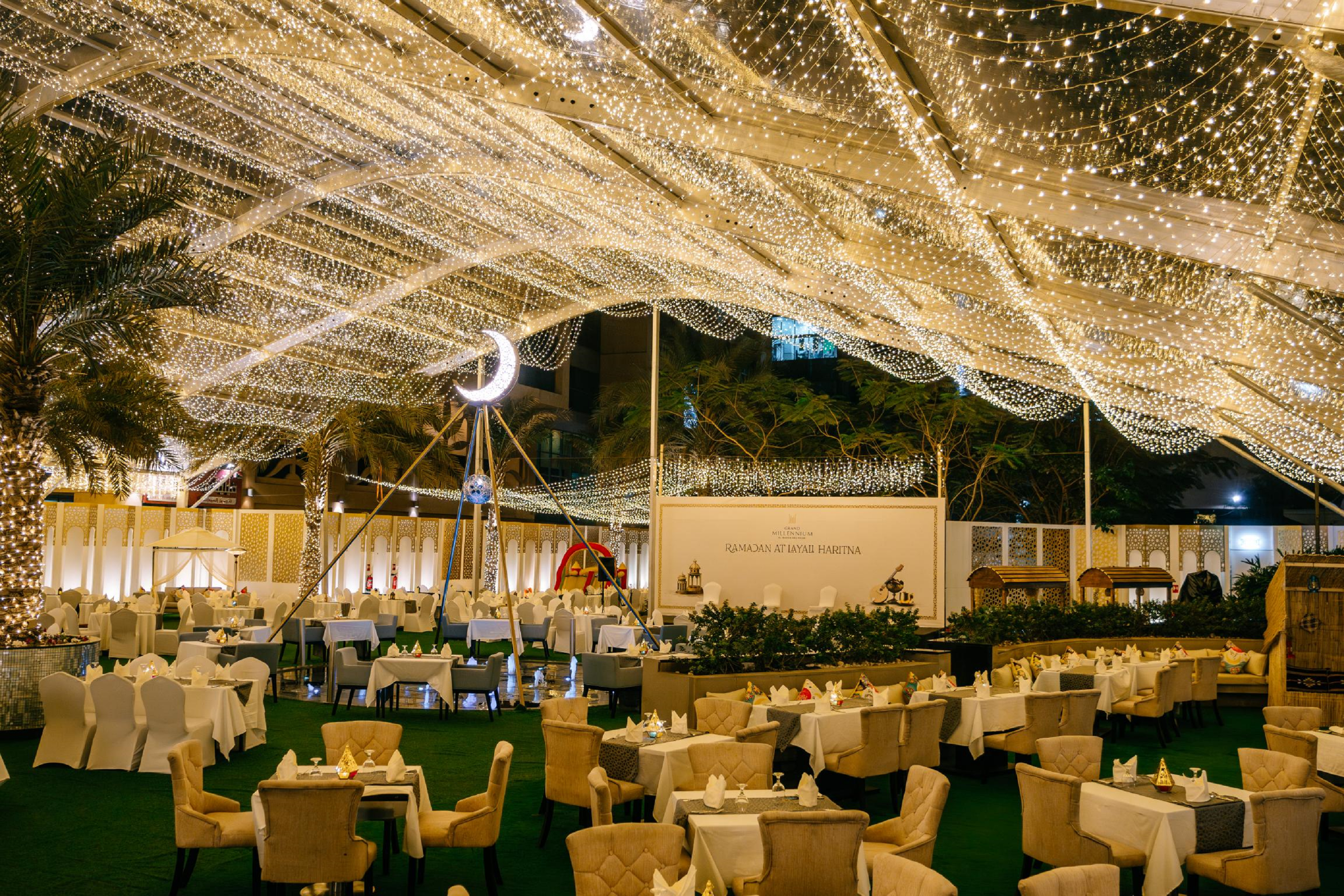 Layali Haritna is a premium Ramadan tent in Abu Dhabi, blending time-honoured traditions with a modern, welcoming atmosphere. Enjoy Iftar with a generous buffet featuring live cooking stations, Arabic and Emirati favourites, international dishes, and classic Ramadan desserts and drinks.