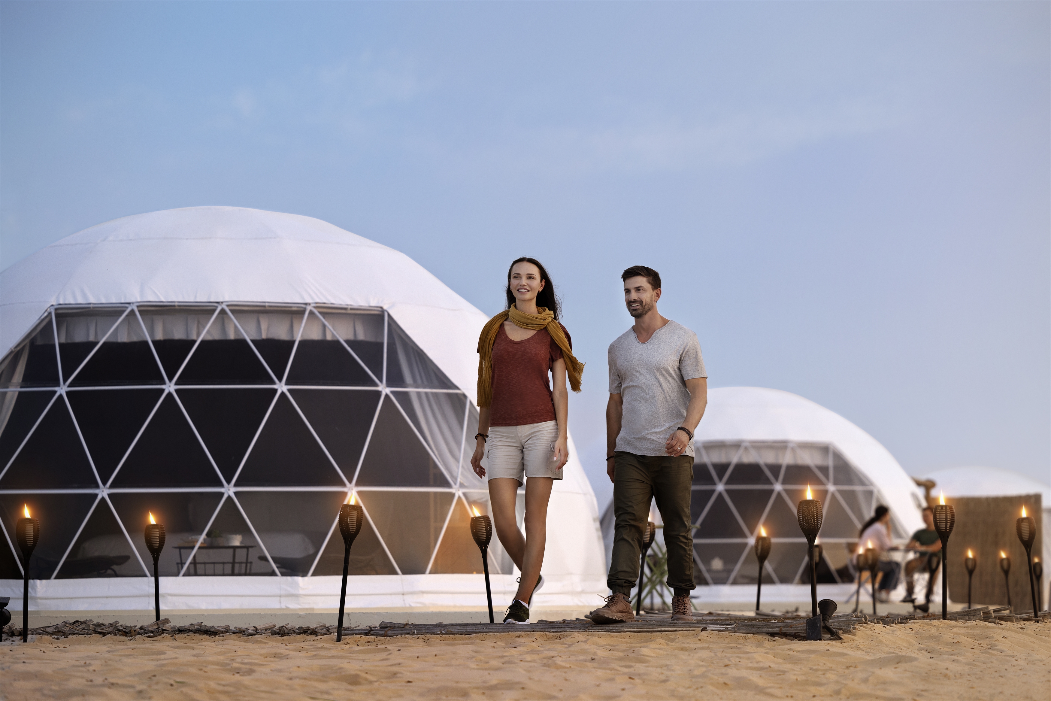 两种选择可带您享受五星级的户外露营体验。这两种露营均有透明的天花板,您可以在入睡前仰望星空。公园的8个空调圆顶帐篷装饰得如同酒店套房,配有冰箱、衣柜、沙发、电视和茶几,设有远眺壮丽山景的露台、篝火坑和望远镜。